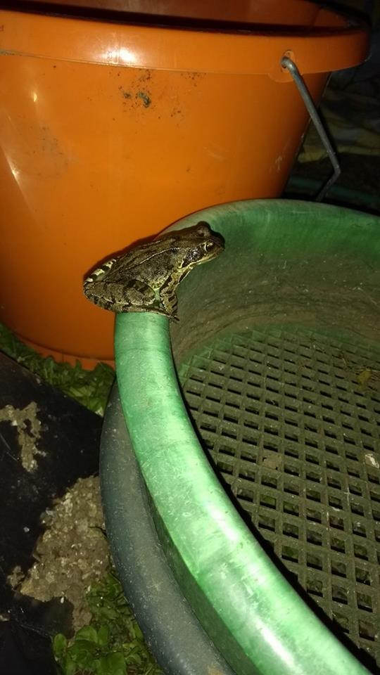 One has made a home by the back door. I have an emergency tub of water to add plants in quick that need a drink/soak. The other night I took a plant out to go and plant it and look what I saw ...